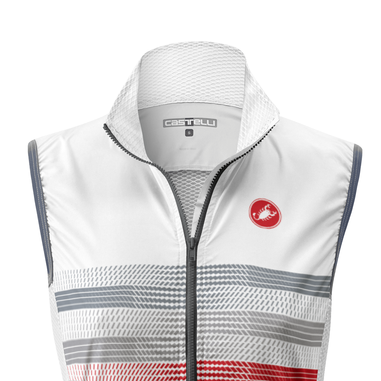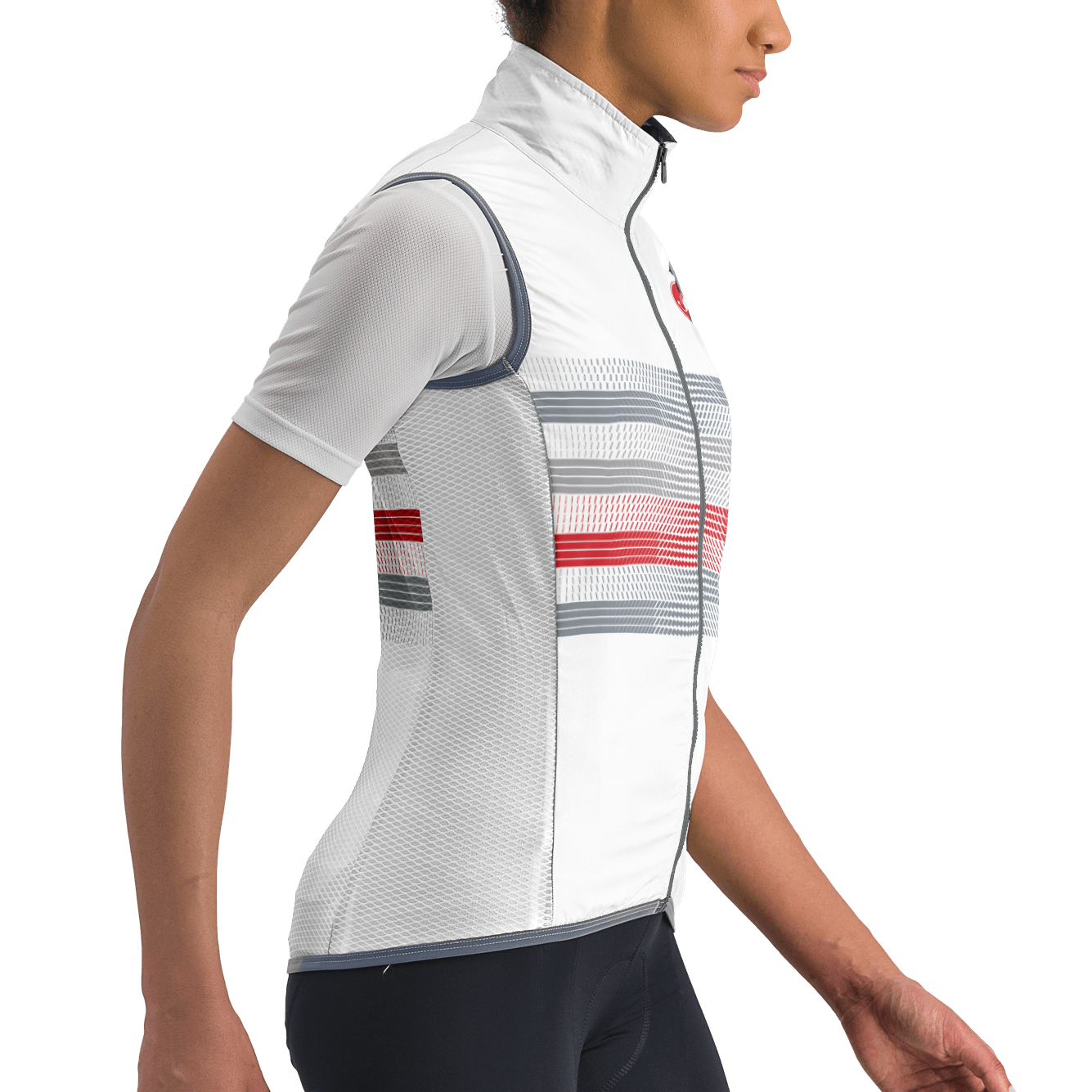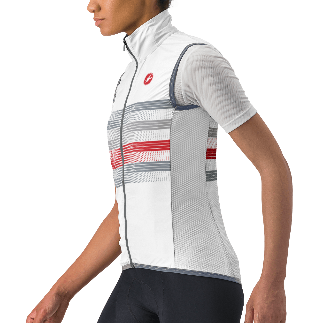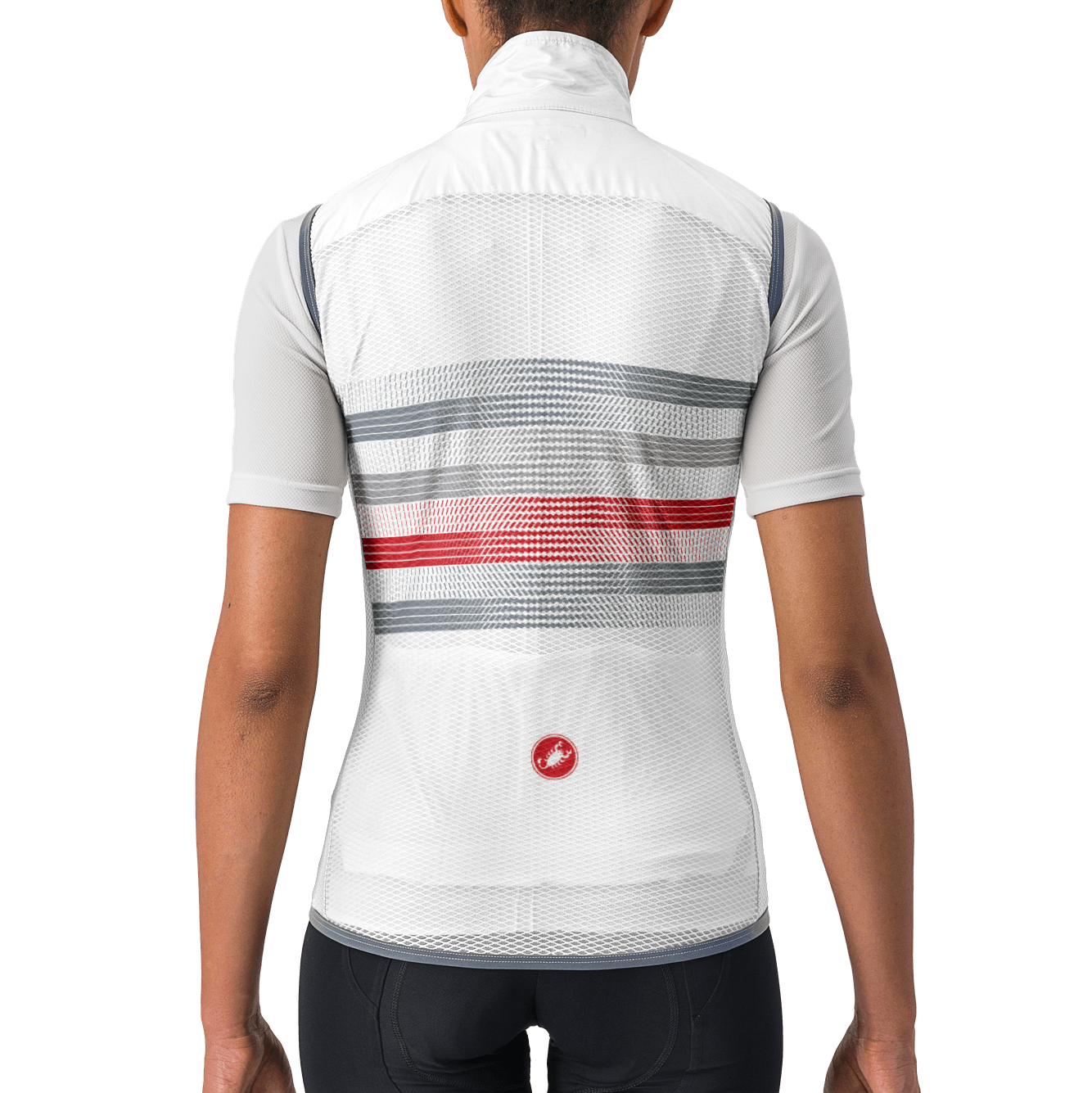Lightweight and packable wind shell that fits close to body with a stretch breathable back and high collar. It effectively blocks wind on the front without causing overheating.